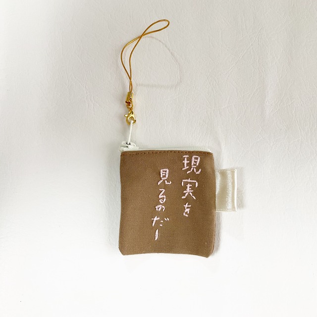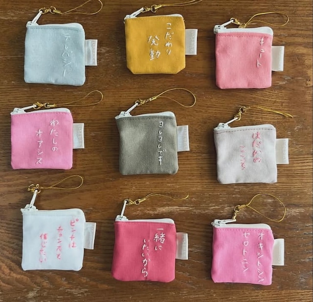 「つれづれなるままに、日暮らし、硯にむかひて、心にうつりゆくよしなしごとを、そこはかとなく書きつくれば、あやしうこそものぐるほしけれ。」 みたいな感じで、生活するなかで思い浮かぶ言葉を刺繍にし、それをちいさなポーチに仕上げました。 一点ものです。 サイズ・約4.5x4.5cm ストラップ付き 裏布なし ファスナー どうぞよろしくお願いいたします。 いろとかたち