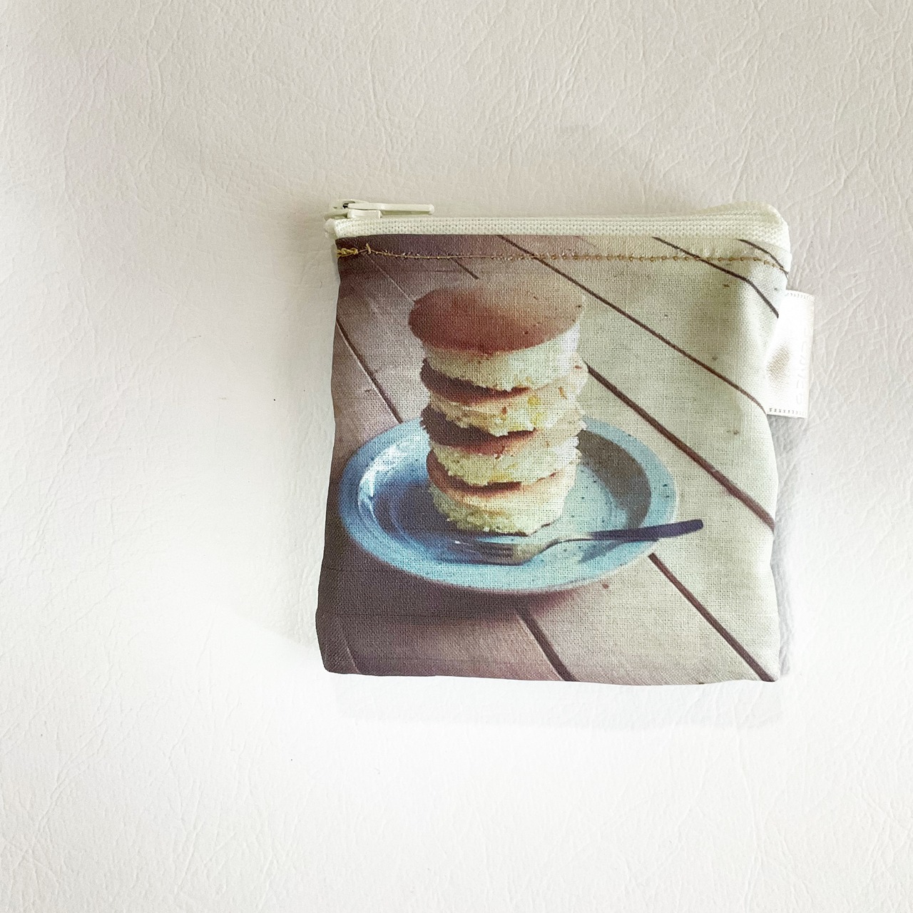散歩中に見かけた草木、作ったごはんやおやつ、作った布こもの、仕事で見かけた古本など、日常のなかで見かけた光景を写真に撮り、それを布にし、ポーチに仕上げました。
