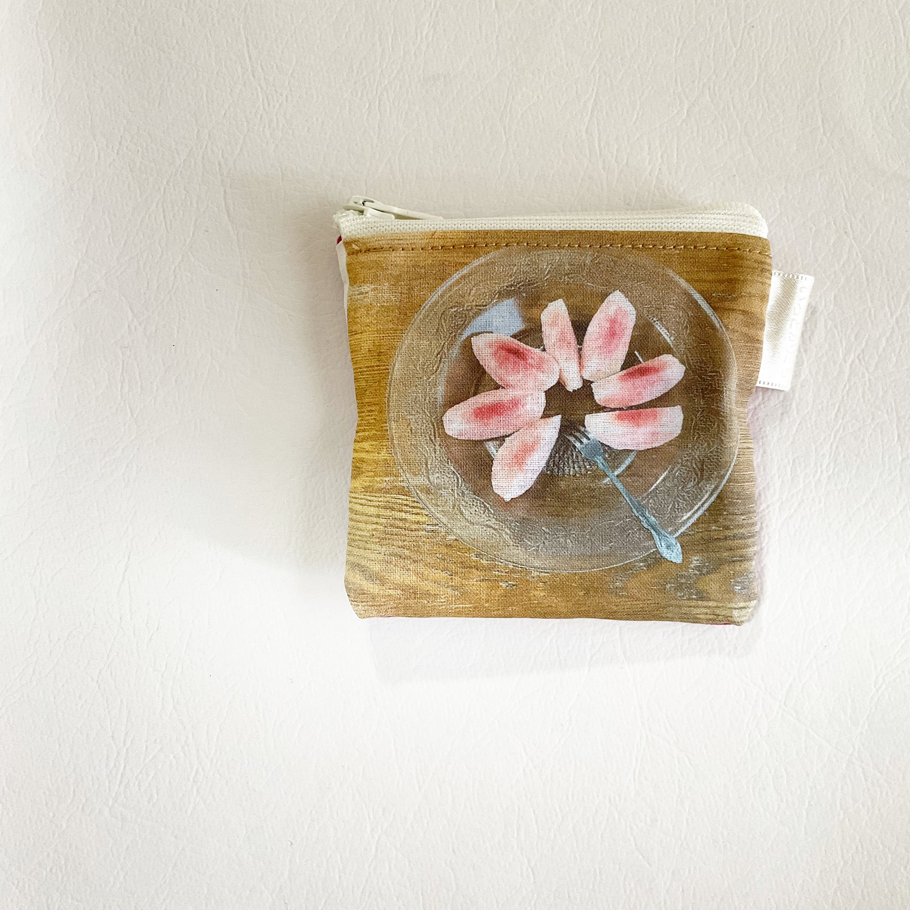 散歩中に見かけた草木、作ったごはんやおやつ、作った布こもの、仕事で見かけた古本など、日常のなかで見かけた光景を写真に撮り、それを布にし、ポーチに仕上げました。