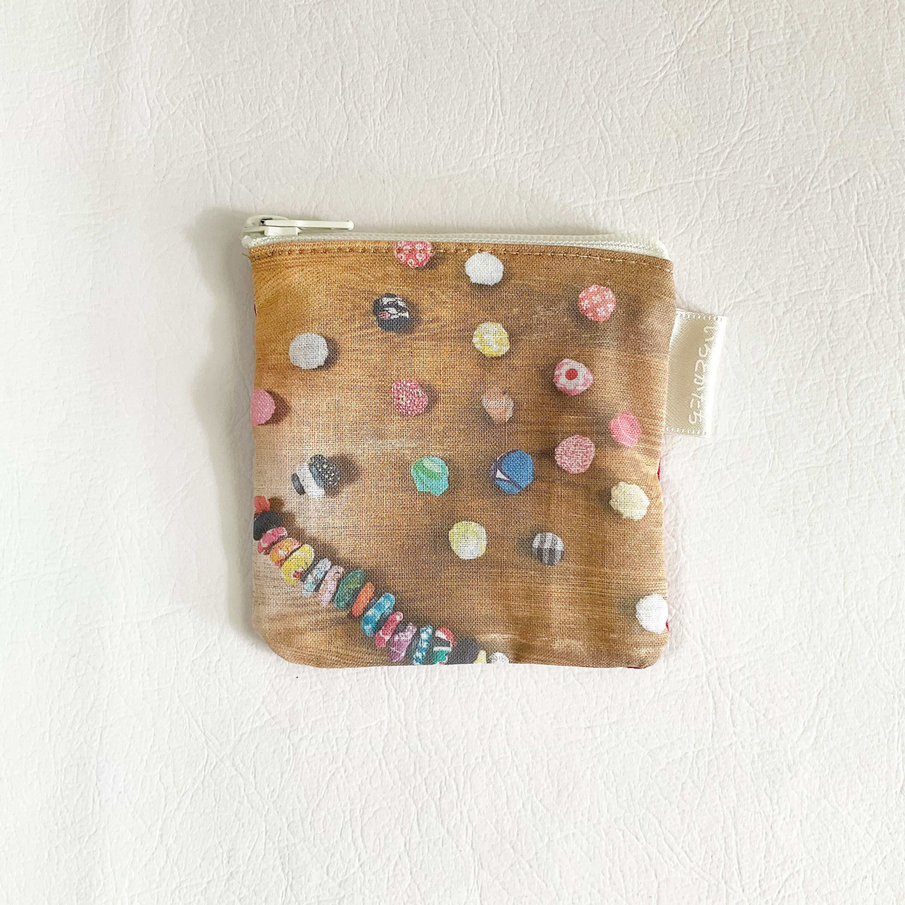 散歩中に見かけた草木、作ったごはんやおやつ、作った布こもの、仕事で見かけた古本など、日常のなかで見かけた光景を写真に撮り、それを布にし、ポーチに仕上げました。