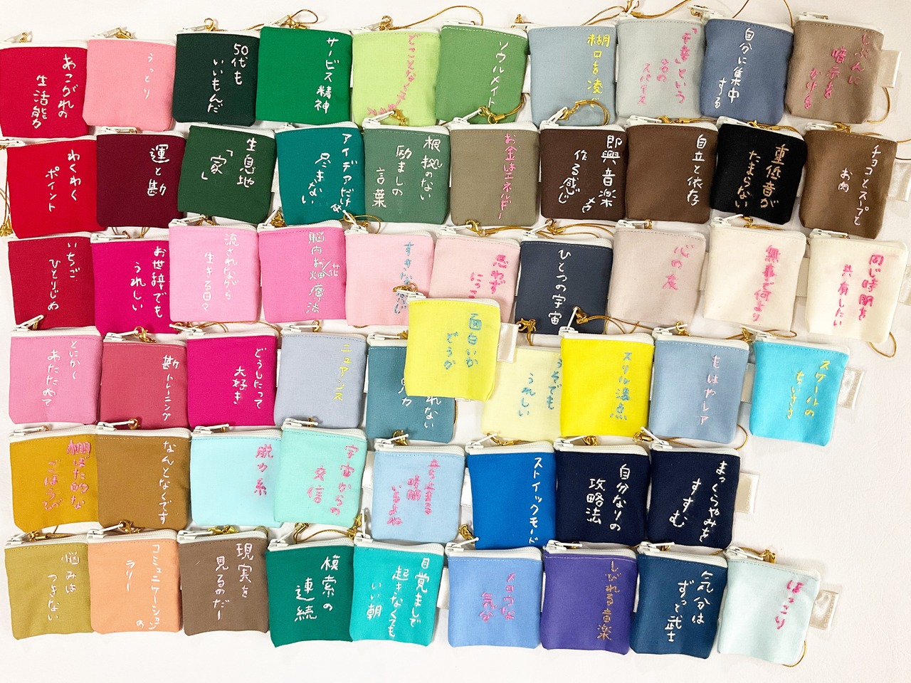 みたいな感じで、生活するなかで思い浮かぶ言葉を刺繍にし、それをちいさなポーチに仕上げました。