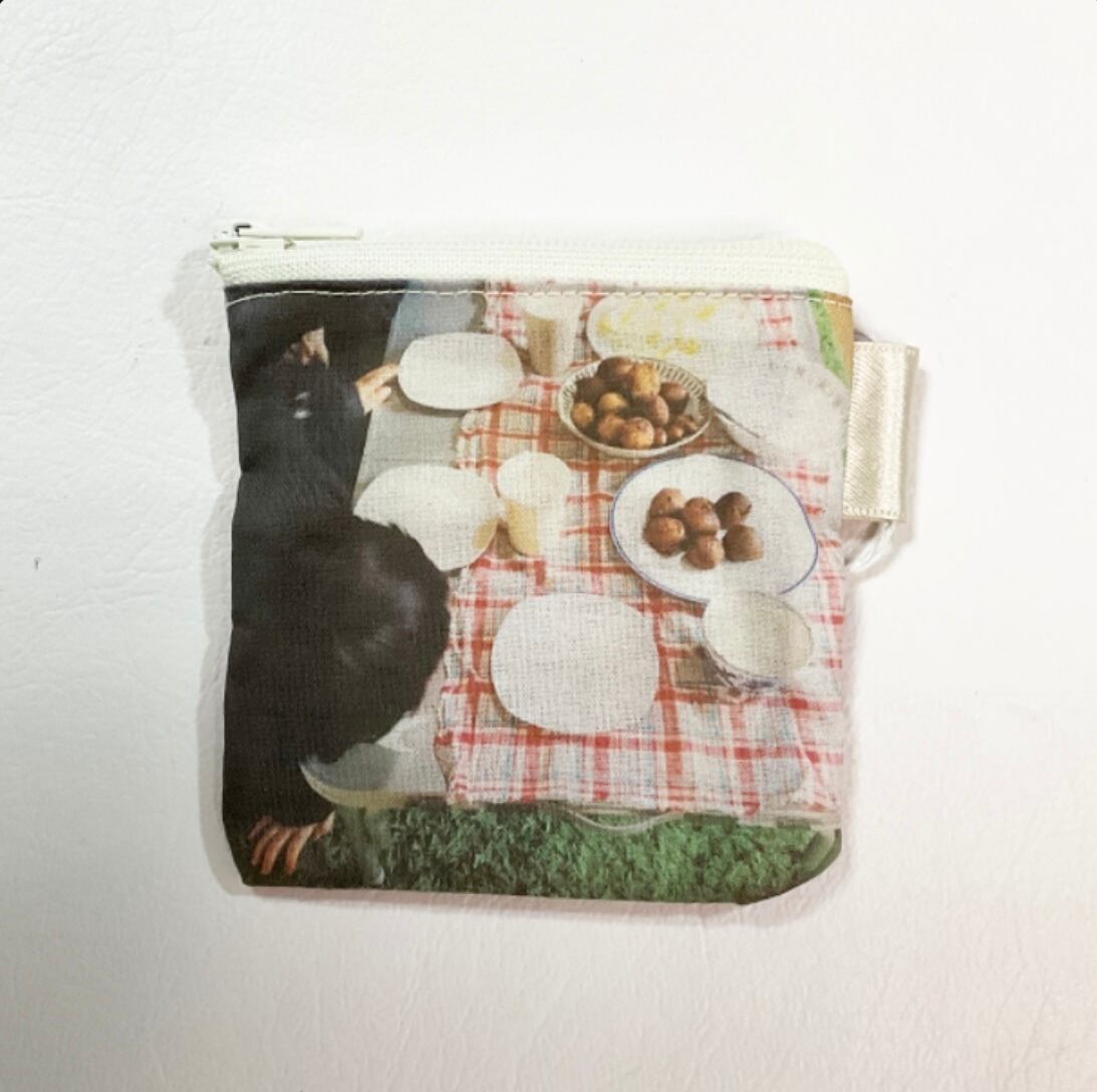 散歩中に見かけた草木、作ったごはんやおやつ、作った布こもの、仕事で見かけた古本など、日常のなかで見かけた光景を写真に撮り、それを布にし、ポーチに仕上げました。