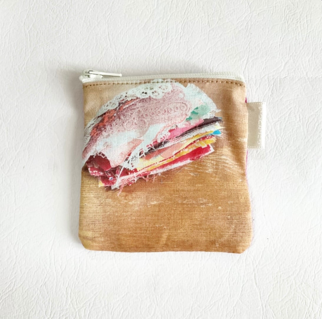 散歩中に見かけた草木、作ったごはんやおやつ、作った布こもの、仕事で見かけた古本など、日常のなかで見かけた光景を写真に撮り、それを布にし、ポーチに仕上げました。