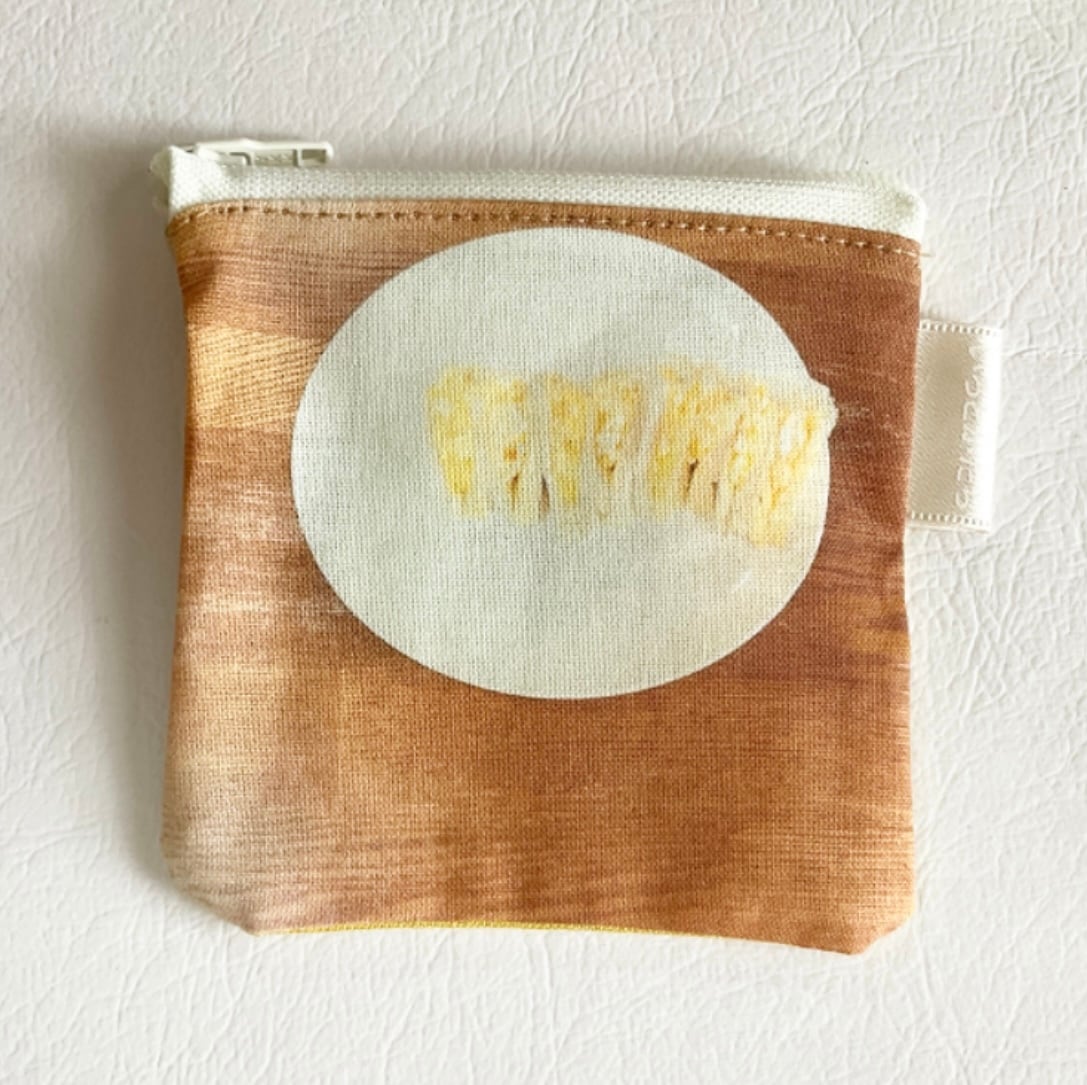 散歩中に見かけた草木、作ったごはんやおやつ、作った布こもの、仕事で見かけた古本など、日常のなかで見かけた光景を写真に撮り、それを布にし、ポーチに仕上げました。