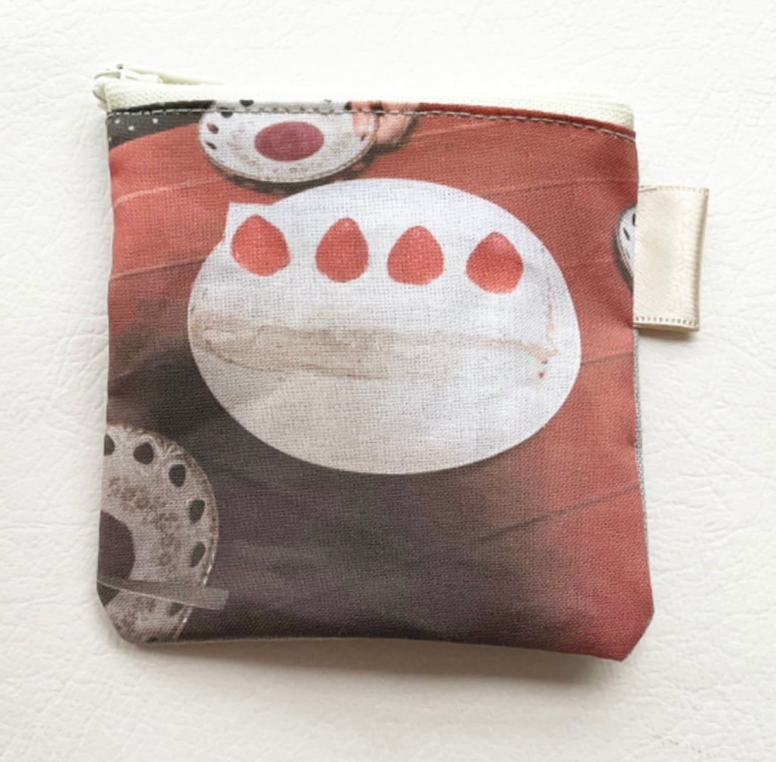 散歩中に見かけた草木、作ったごはんやおやつ、作った布こもの、仕事で見かけた古本など、日常のなかで見かけた光景を写真に撮り、それを布にし、ポーチに仕上げました。