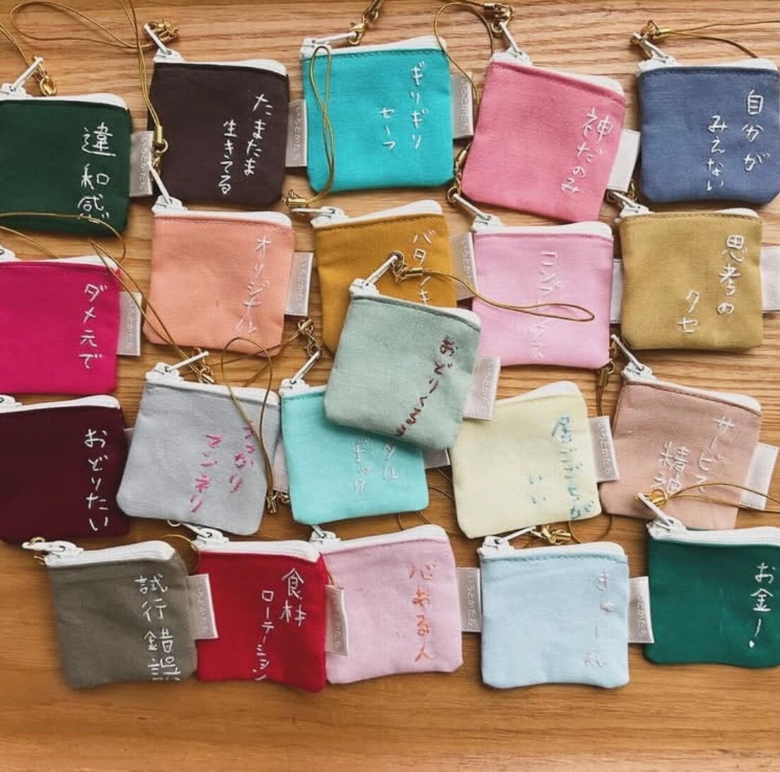 みたいな感じで、生活するなかで思い浮かぶ言葉を刺繍にし、それをちいさなポーチに仕上げました。