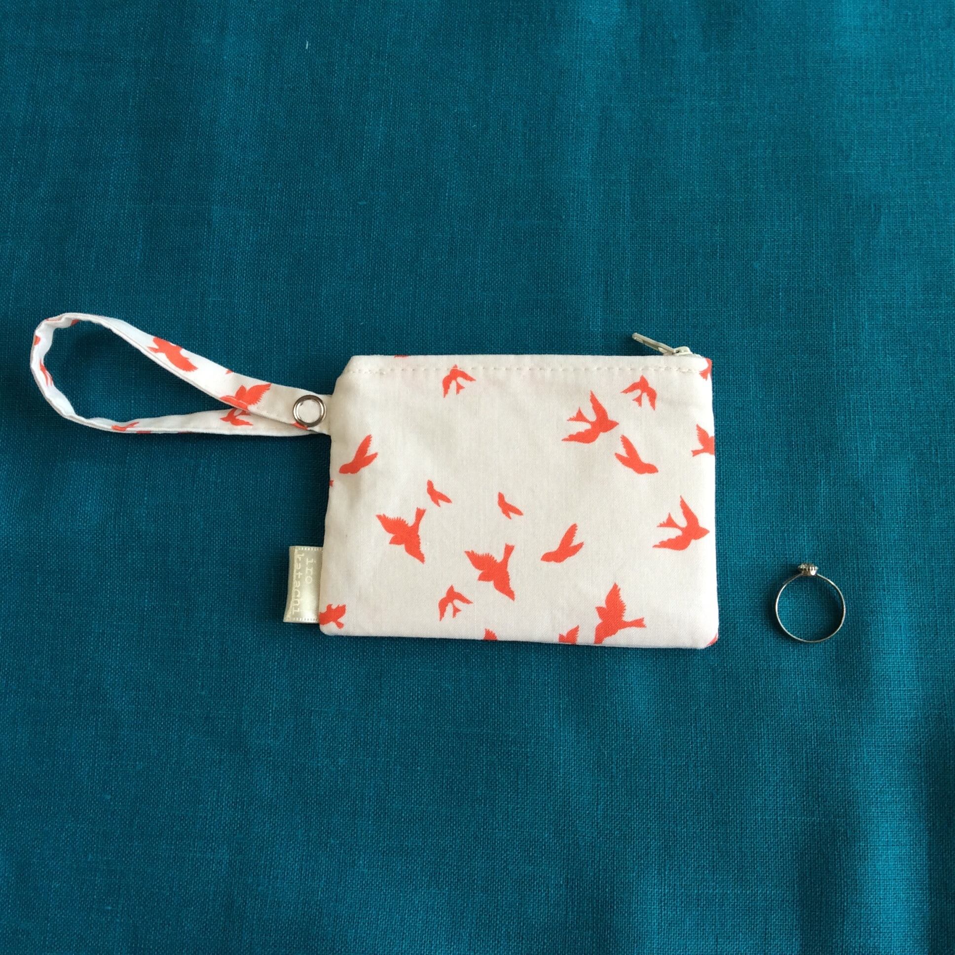 しゅいろのトリのデザインが かっこいい布で、ちいさいポーチをつくりました。