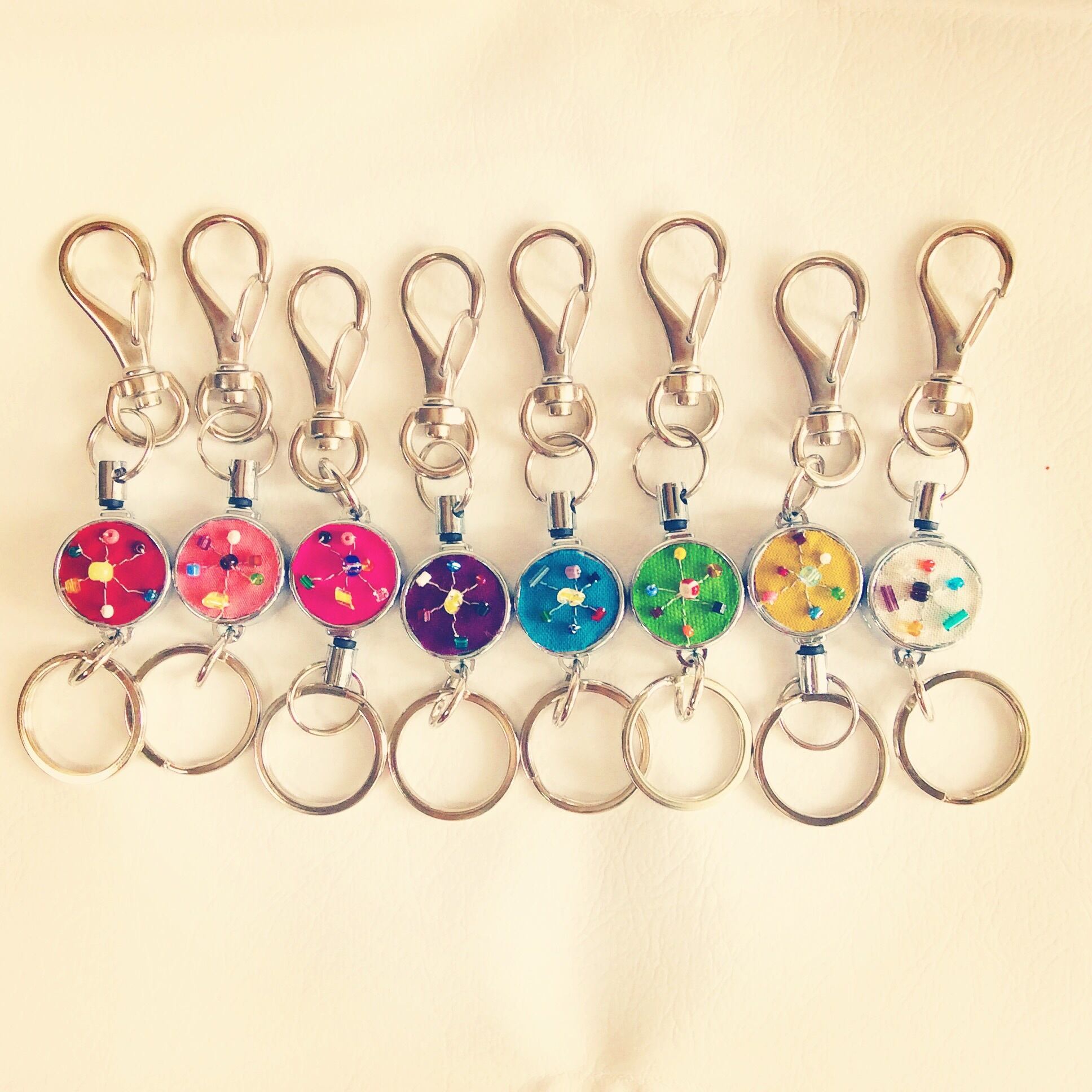 リールつきのキーホルダーに、チェコのヴィンテージガラスビーズを縫いつけました。