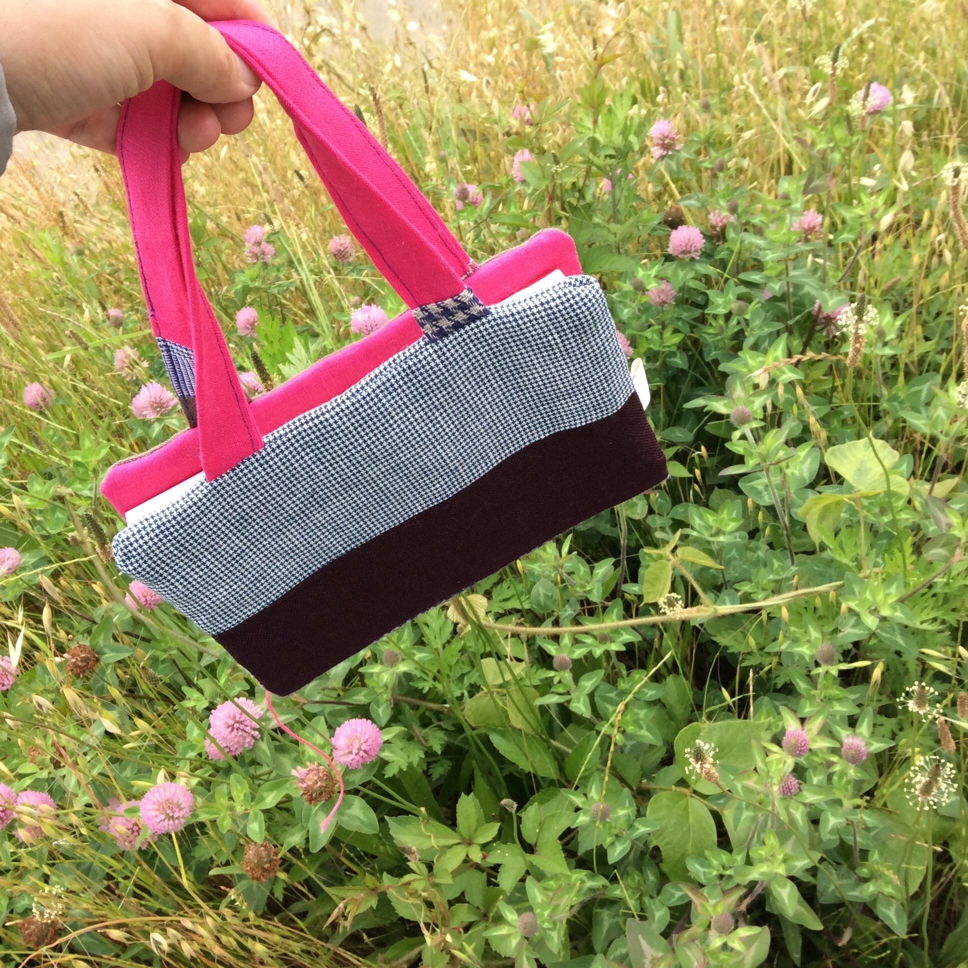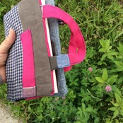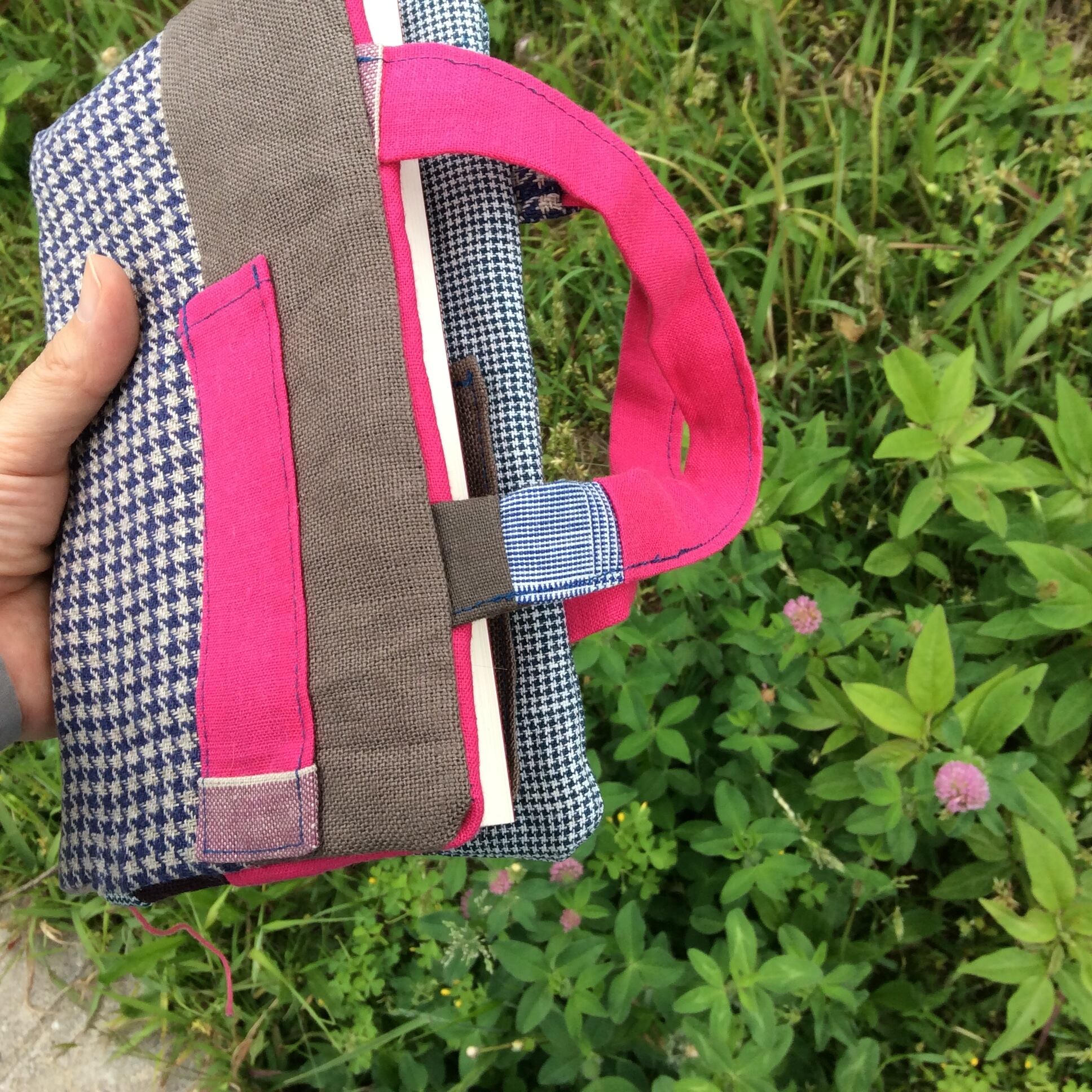 色のちがうリネンを合わせて作った「持ち手つきのブックカバー」です。
