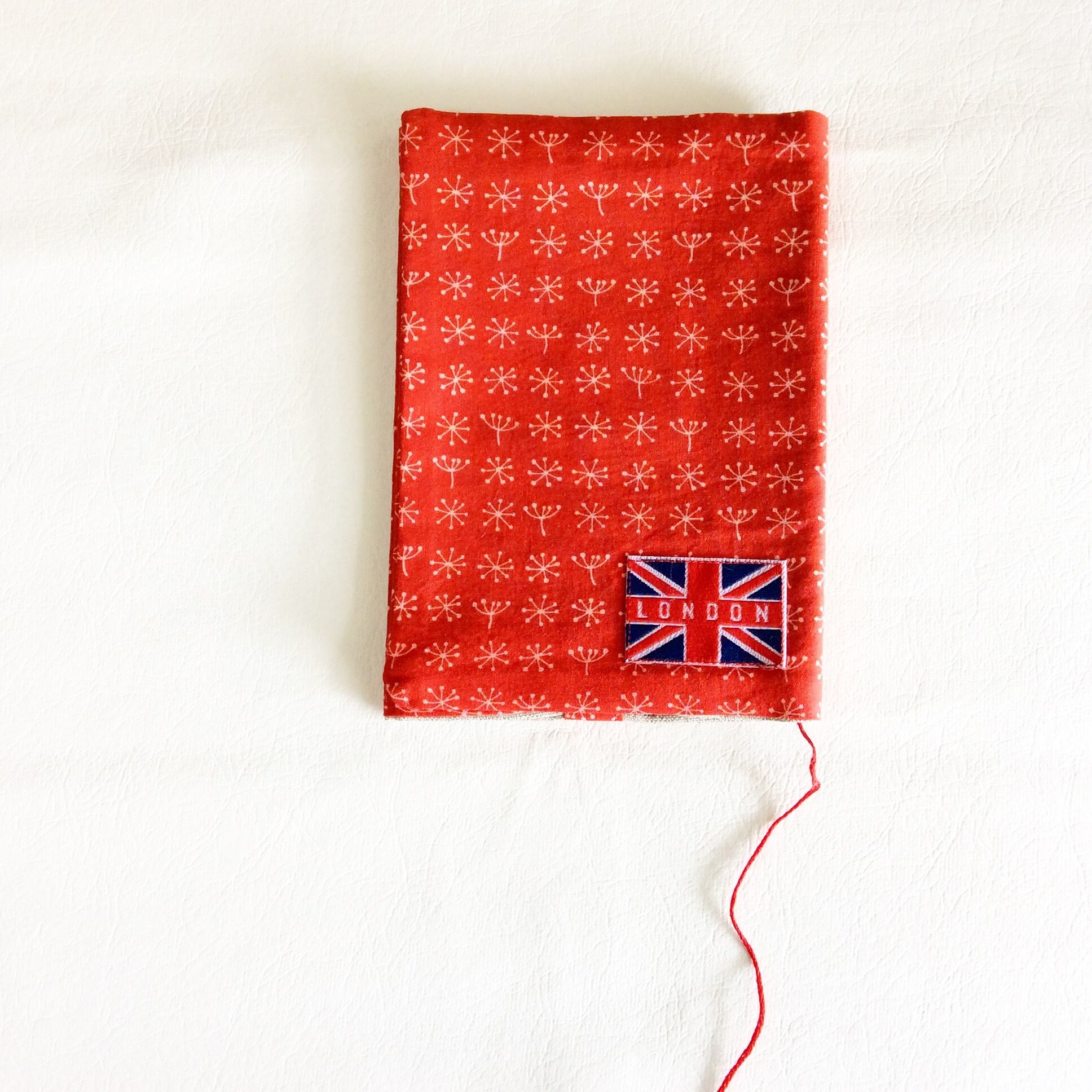わた系柄の赤い布に、LONDONのアクセント付きのブックカバーです。