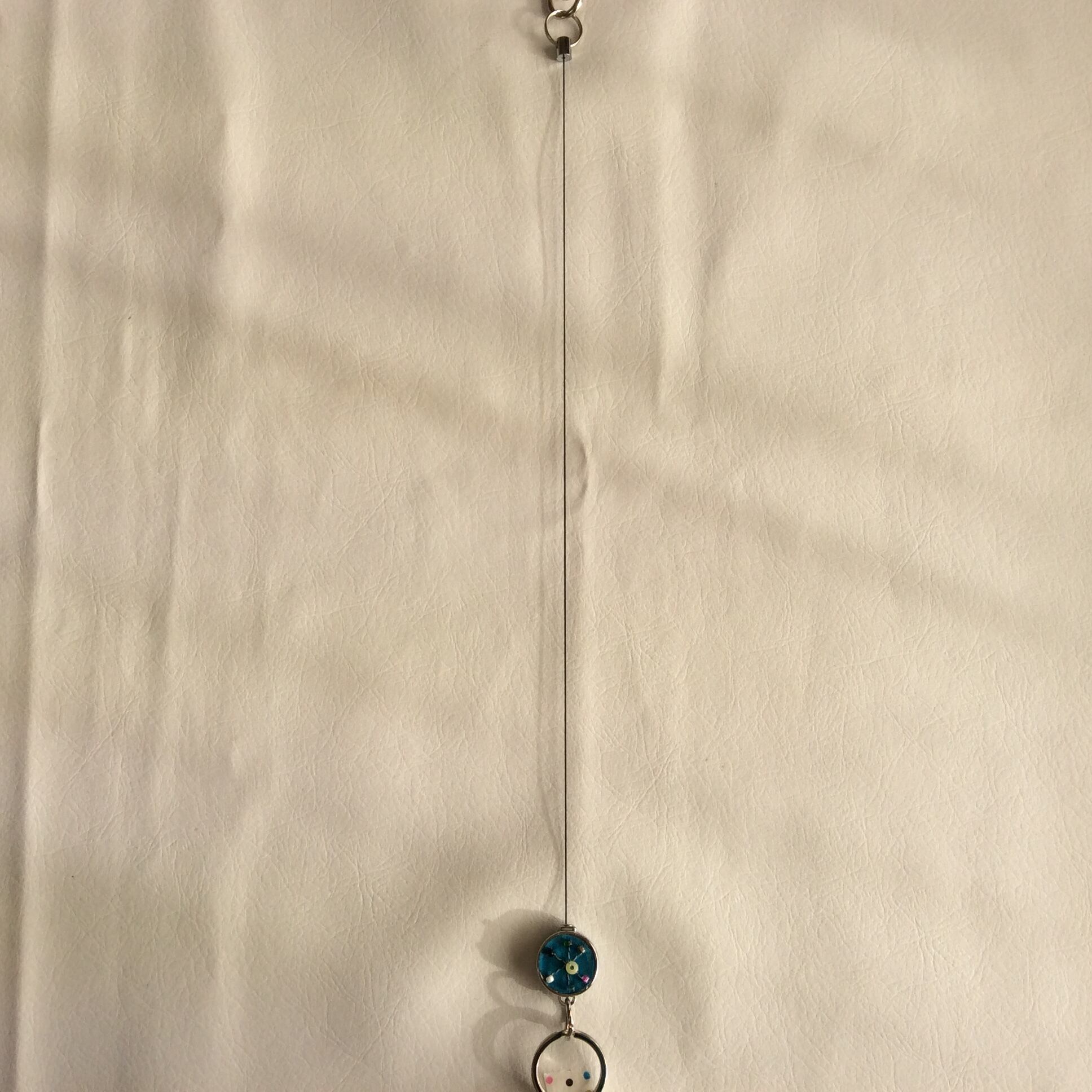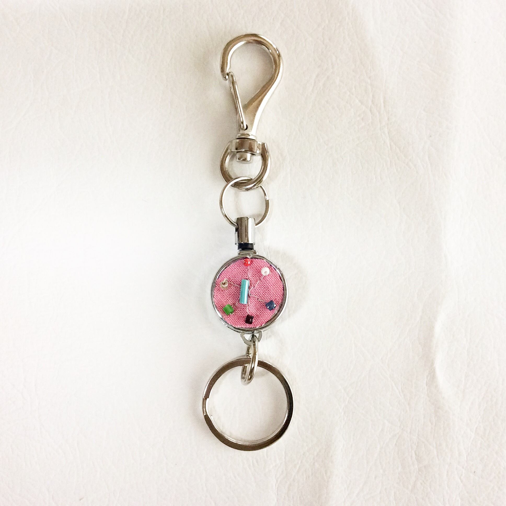 リールつきのキーホルダーに、チェコのヴィンテージガラスビーズを縫いつけました。