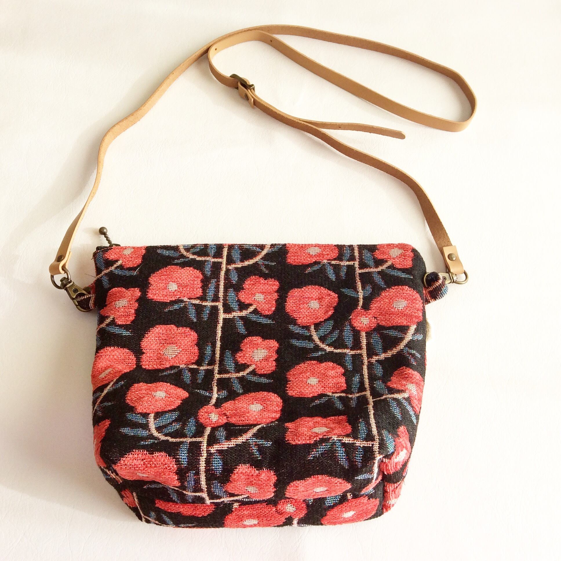 花柄が可愛らしい冬ものの布で、ショルダーバッグ、ポシェット、化粧ポーチ、ペンケースを作りました。冬のほっこりアイテムにいかがですか。