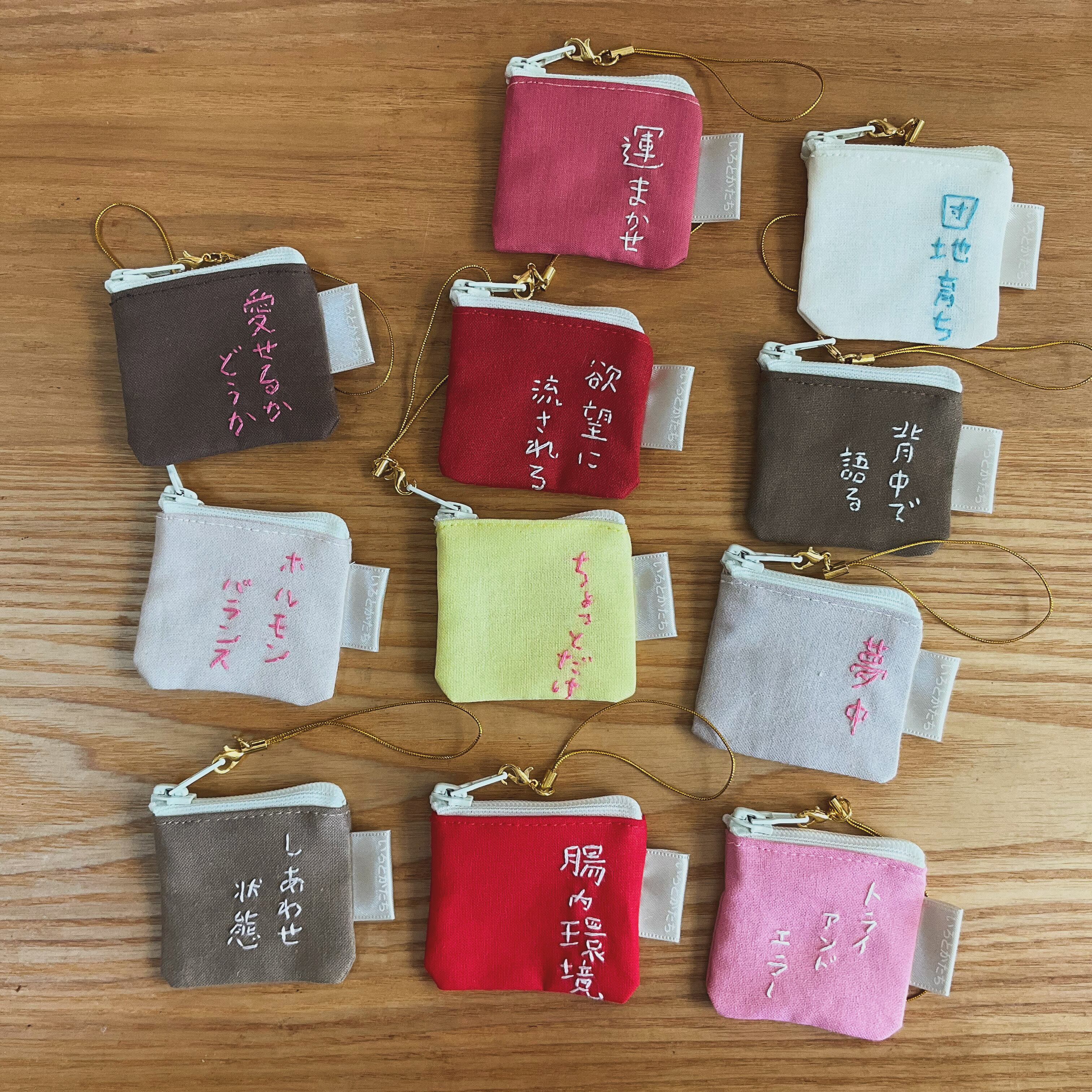 みたいな感じで、生活するなかで思い浮かぶ言葉を刺繍にし、それをちいさなポーチに仕上げました。