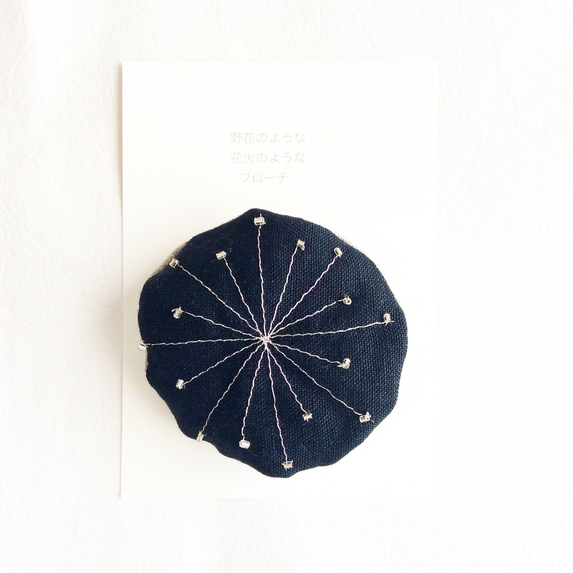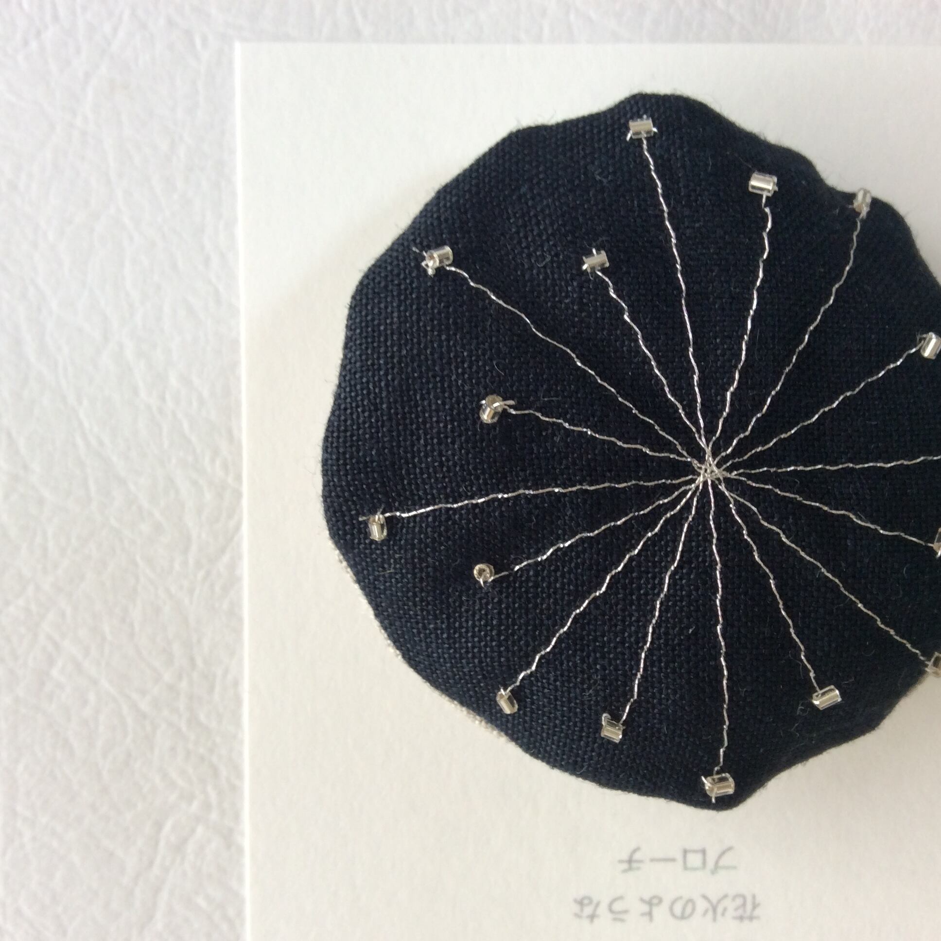 リネンの布に、チェコのビンテージガラスビーズを縫いつけて、ブローチをつくりました。
