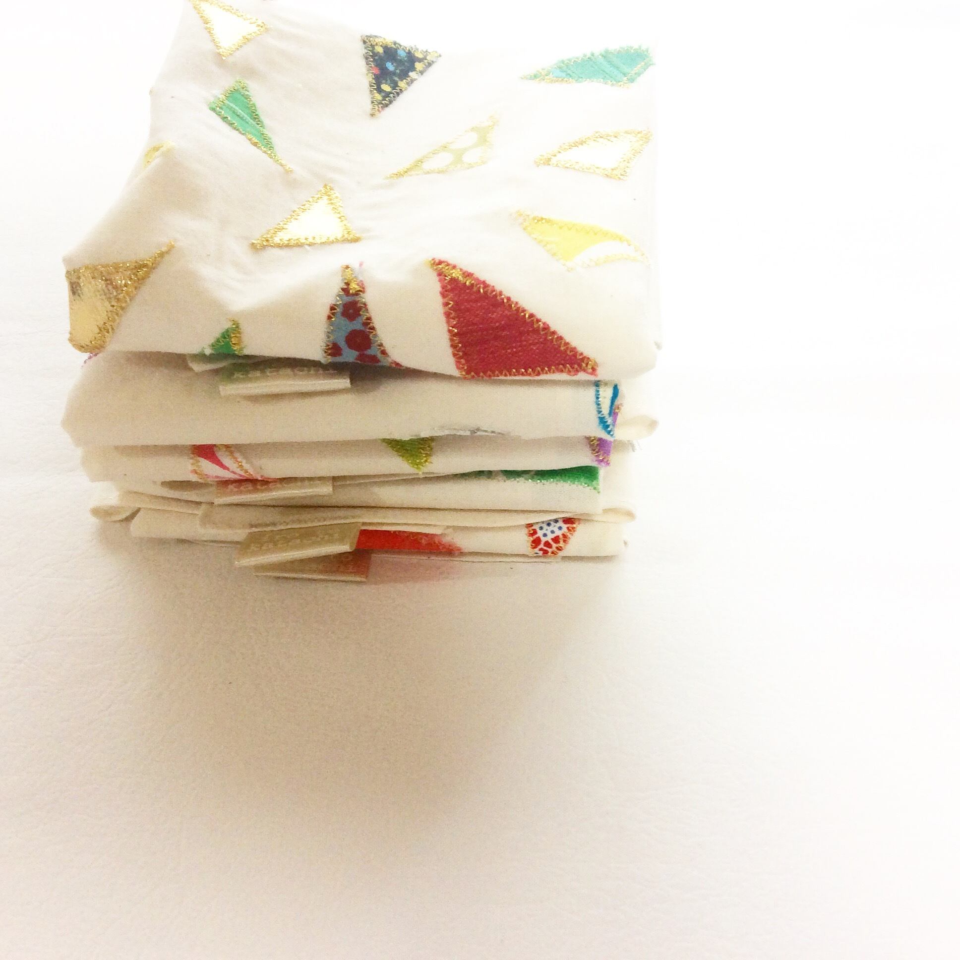 そのときどきに手元にあるハギレを使って、紙にコラージュするように、何かのインスピレーションで 布にコラージュしています。そのため、だいたいが一点ものです。