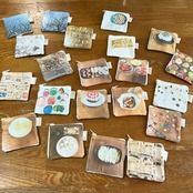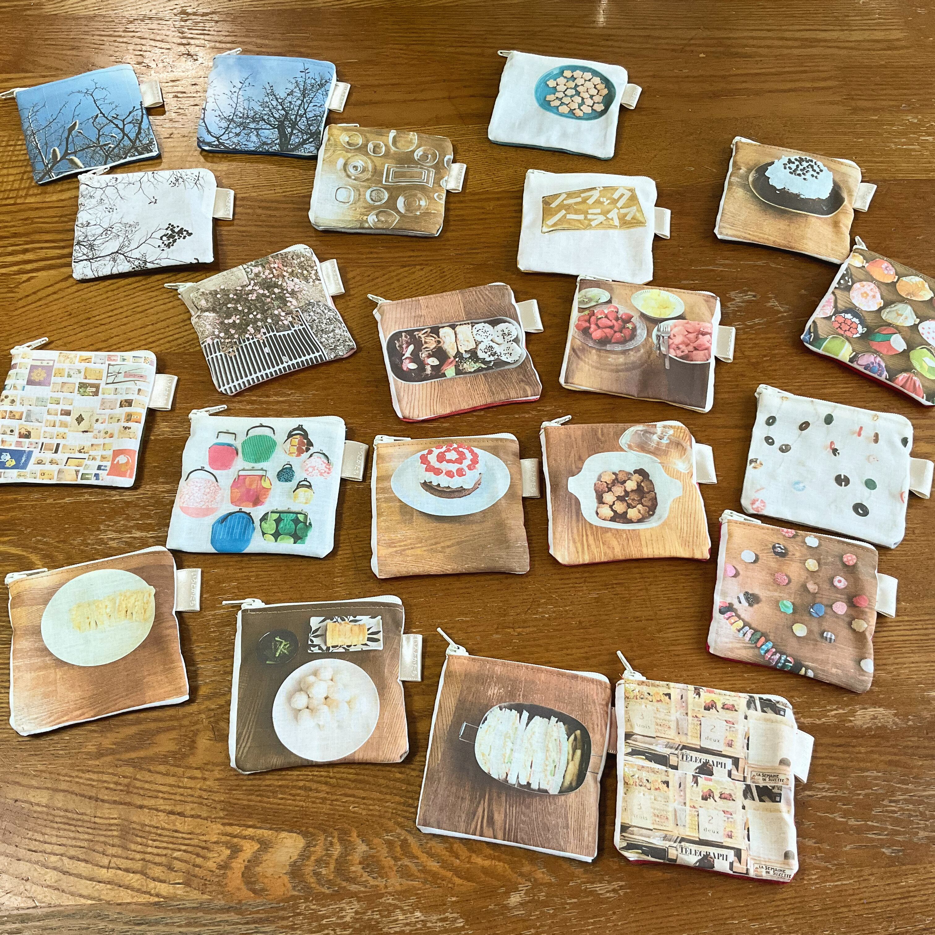 散歩中に見かけた草木、作ったごはんやおやつ、作った布こもの、仕事で見かけた古本など、日常のなかで見かけた光景を写真に撮り、それを布にし、ポーチに仕上げました。